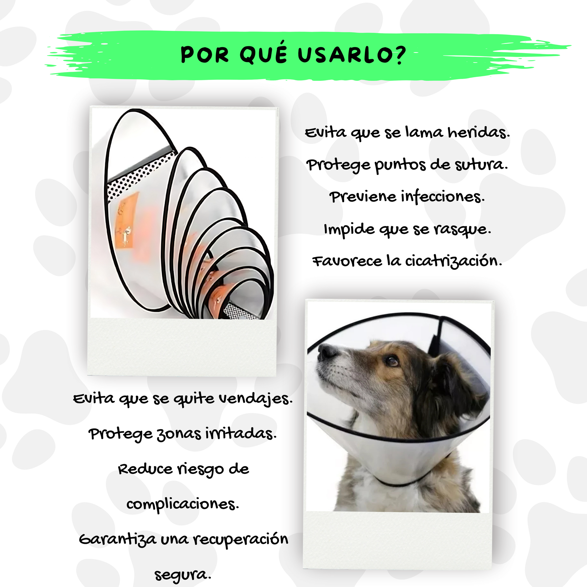 Su forma cónica evita que el animal lama, muerda o rasque heridas, puntos de sutura o zonas irritadas, promoviendo una cicatrización segura y efectiva.
