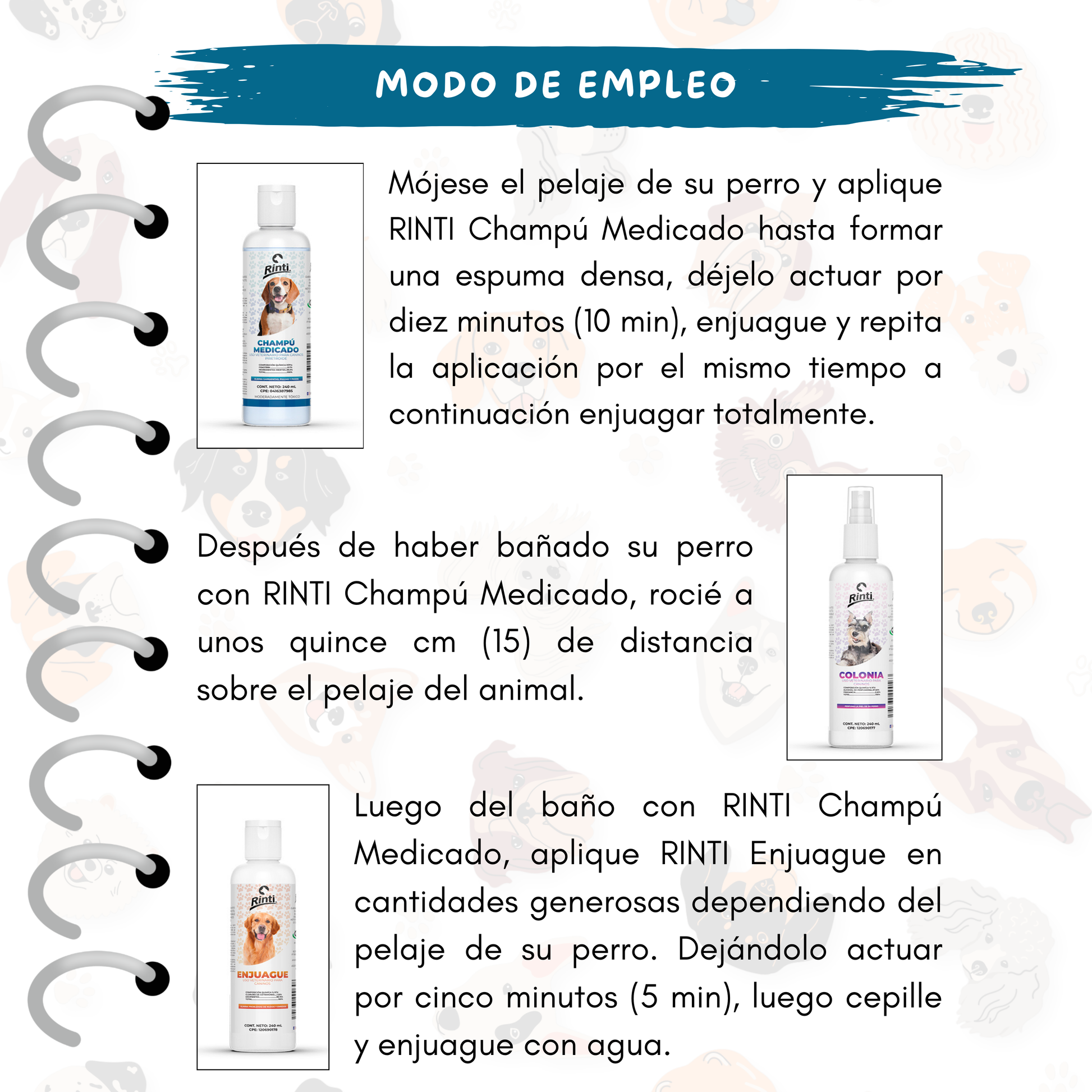 Modo de empleo: Luego del baño con RINTI Champú Medicado, aplique RINTI Enjuague en cantidades generosas dependiendo del pelaje de su perro. Dejándolo actuar por cinco minutos (5 min), luego cepille y enjuague con agua.